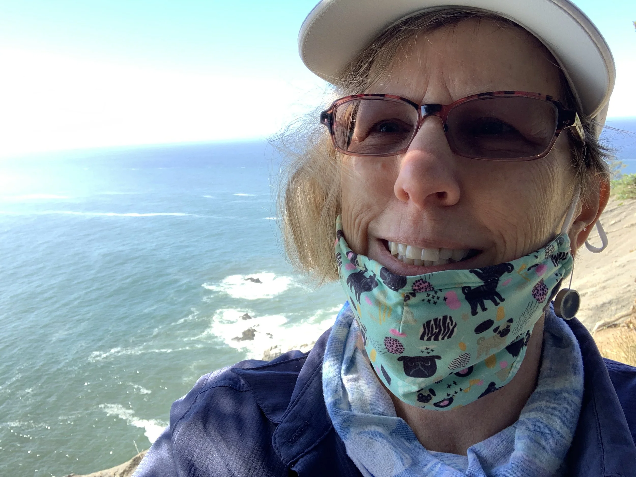 Remember fabric masks? Before we knew better. This was a birthday hike in September 2020 when I was still wearing a mask hiking in case I saw anyone on coming the other way and I could pull it up. We were all sorting it out together. View is from Falcon Cove Hike, North Oregon Coast.
